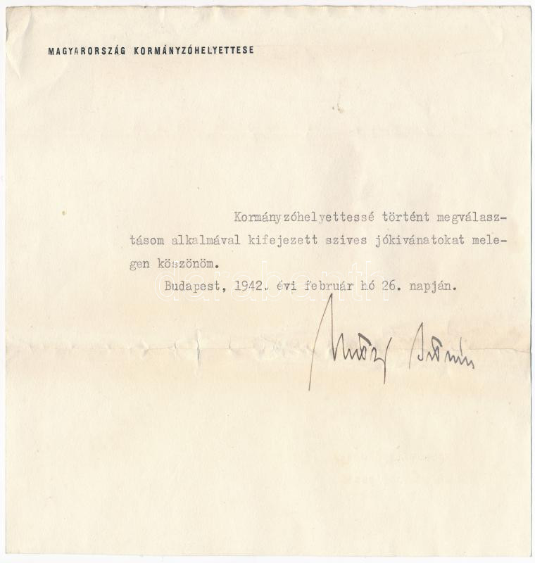 1942 Bp., Horthy István (1904-1942) köszönő levele kormányzóhelyettess... https://www.darabanth.com/de/21-Gross-Auktion/21.1/Kunst-Dokumente/~7506/1942-Bp-Horthy-Istvan-1904-1942-koszono-levele-kormanyzohelyettesse-valo-kinevezese-alk~II1082647