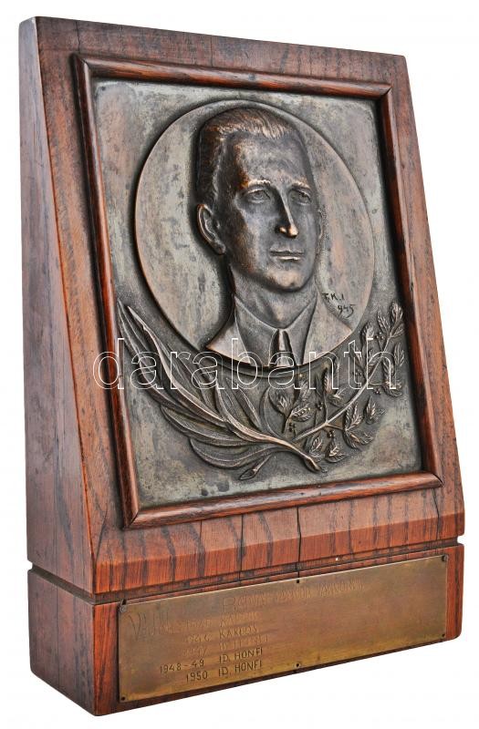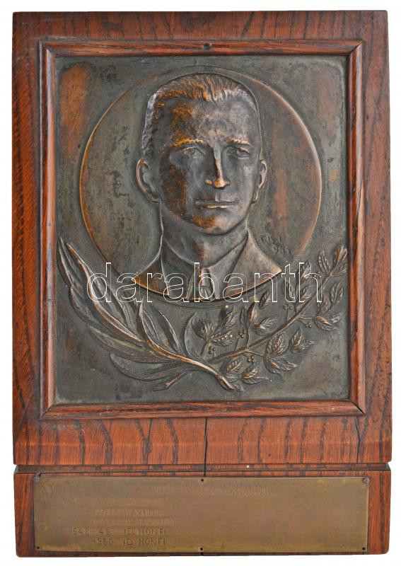 Turáni Kovács Imre (1910-1975) 1945. "Rajnai Sándor Vándordíj" Br lemezplakett (~210x185mm) gravírozott táblával fakeretben (330x225mm) T:2,2- kereten repedés Hungary 1945. "Sándor Rajnai Challenge Cup" Br one-sided plaque (~210x185mm) with engraved plate in wooden frame. Sign.: Imre Turáni Kovács (330x225mm) C:XF,VF cracked frame
