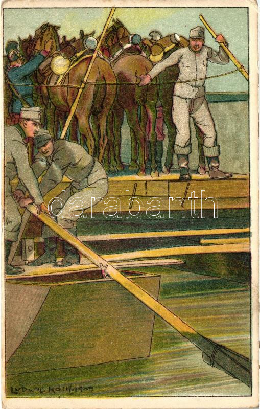Beschreibung: 1909 Utászok egy transzportnak a vízen való átszállításánál / K.u.K. army, pioneer unit assisting with transportation s: Ludwig Koch