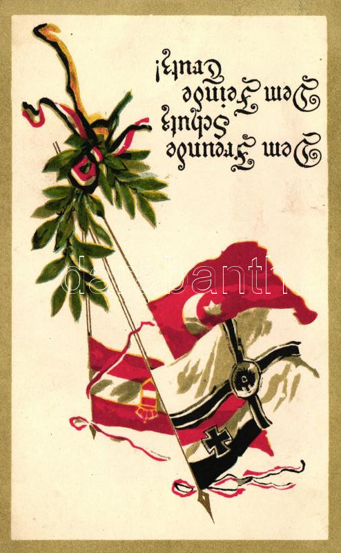 Beschreibung: Dem Freunde Schutz, Dem Feinde Trutz; S.V.D. Serie 3026/2 / Hungarian-Austrian-German-Turkish association, flags, litho