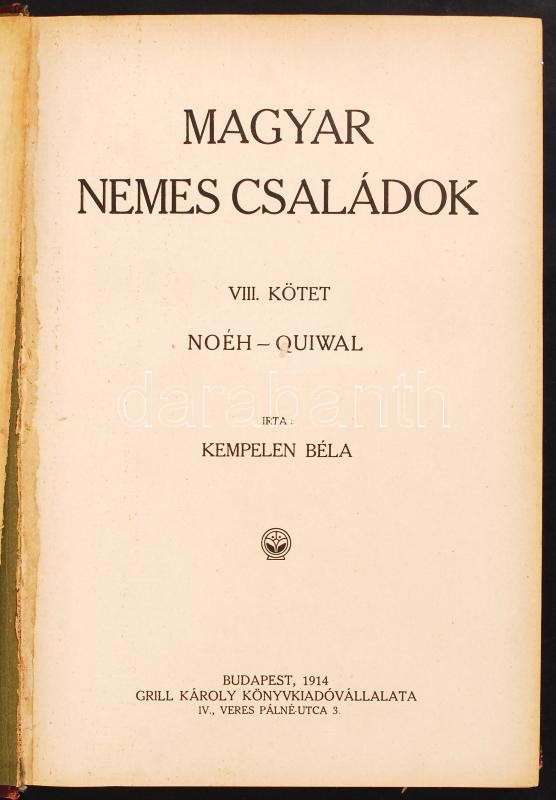 Kempelen Béla: Magyar nemes családok. VIII. köt. (Noéh-Qiuwal) Bp. 191... https://www.darabanth.com/de/210-Fernauktion/210.0/Andere-Sammelgebiete/Bucher-Geschichte~600045/Kempelen-Bela-Magyar-nemes-csaladok-VIII-kot-Noeh-Qiuwal-Bp-1914-Kiadoi-aranyozott-ege~II865527