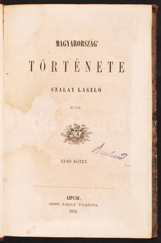 Szalay László: Magyarország története I. kötet. Lipcse, 1852, Geibel K... https://www.darabanth.com/de/210-Fernauktion/210.0/Andere-Sammelgebiete/Bucher-Geschichte~600045/Szalay-Laszlo-Magyarorszag-tortenete-I-kotet-Lipcse-1852-Geibel-Karoly-Felvaszon-kot~II864634