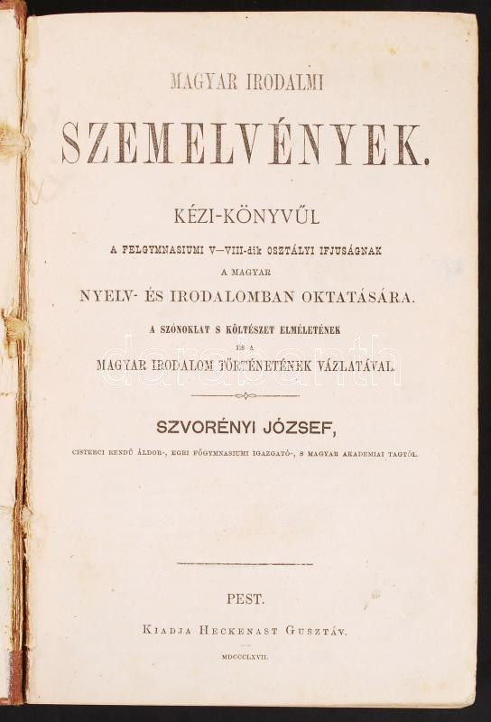 Szvorényi József: Magyar Irodalmi szemelvények kézi-könyvűl a felgymnásiumi V-VIII-dik osztályi ifjuságnak... Pest, 1867. 734p. Korabeli félvászon kötésben