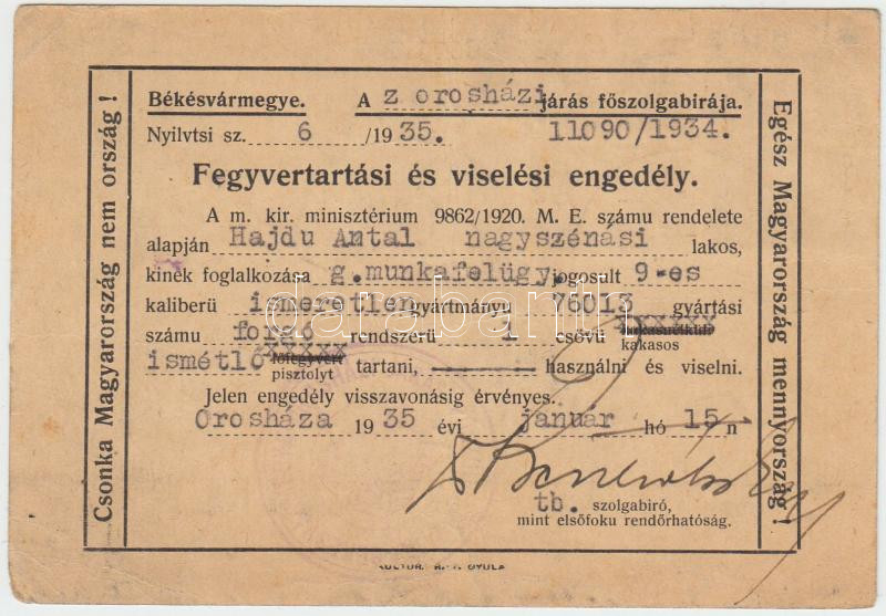1935 Békésvármegye fegyvertartási engedély https://www.darabanth.com/de/210-Fernauktion/210.0/Andere-Sammelgebiete/Dokument~600015/1935-Bekesvarmegye-fegyvertartasi-engedely~II656179