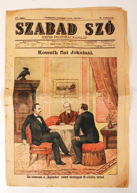 1894 Bp., Szabad Szó, Képes Politikai Napilap, II. évfolyam 97. szám, ... https://www.darabanth.com/de/210-Fernauktion/210.0/Andere-Sammelgebiete/Drucksachen~600026/1894-Bp-Szabad-Szo-Kepes-Politikai-Napilap-II-evfolyam-97-szam-cimlapon-Kossuth-Kossuth-~II837462
