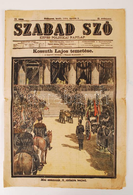 1894 Bp., Szabad Szó, Képes Politikai Napilap, Kossuth temetését ábráz... https://www.darabanth.com/de/210-Fernauktion/210.0/Andere-Sammelgebiete/Drucksachen~600026/1894-Bp-Szabad-Szo-Kepes-Politikai-Napilap-Kossuth-temeteset-abrazolo-szines-keppel-es~II837452
