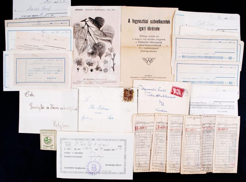 Beschreibung: 1932-1949 Vegyes nyomtatványok: gyászjelentések (3 db), befizetési igazolások, leírás a fogyasztási szövetkezetek helyzetéről