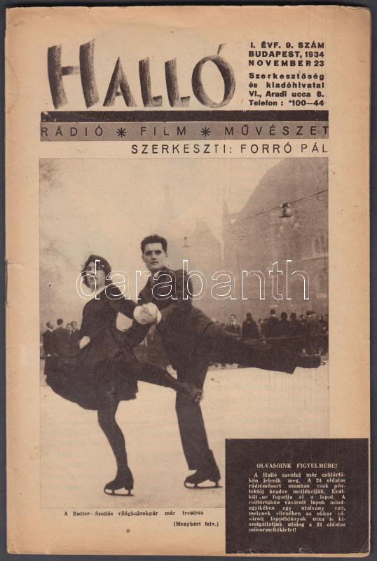 1934 Halló - Rádió, film, művészet. 9. szám 62p. https://www.darabanth.com/de/210-Fernauktion/210.0/Andere-Sammelgebiete/Drucksachen~600026/1934-Hallo--Radio-film-muveszet-9-szam-62p~II852627