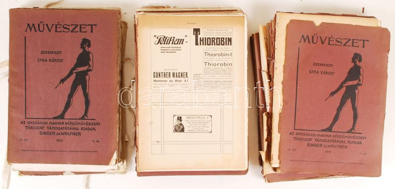 Lyka Károly (szerk.): Művészet, IX.-XI. évfolyamok kompletten. Bp., 1910-1912, Singer és Wolfner. Külön külön számok egybegyűjtve néhol sérült borítókkal, készen az évfolyamba kötésre. Rengeteg illusztrációval
