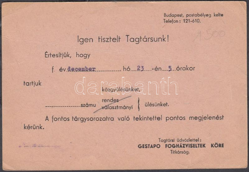 cca 1945 Gestapo Fogházviseltek körének meghívója közgyűlésre https://www.darabanth.com/de/210-Fernauktion/210.0/Andere-Sammelgebiete/Drucksachen~600026/cca-1945-Gestapo-Foghazviseltek-korenek-meghivoja-kozgyulesre~II868188