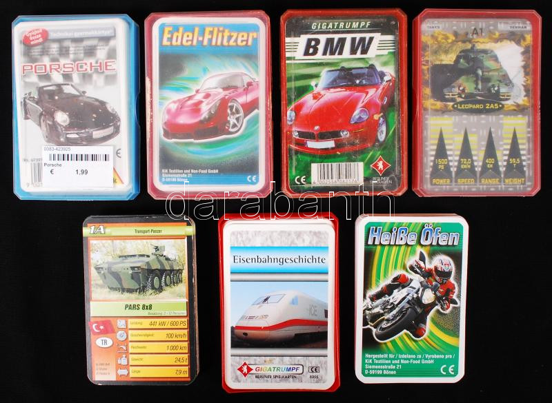 7 pakli kártya (autók, motorok, katonai járművek) https://www.darabanth.com/de/210-Fernauktion/210.0/Andere-Sammelgebiete/Flohmarkt~600011/7-pakli-kartya-autok-motorok-katonai-jarmuvek~II868672