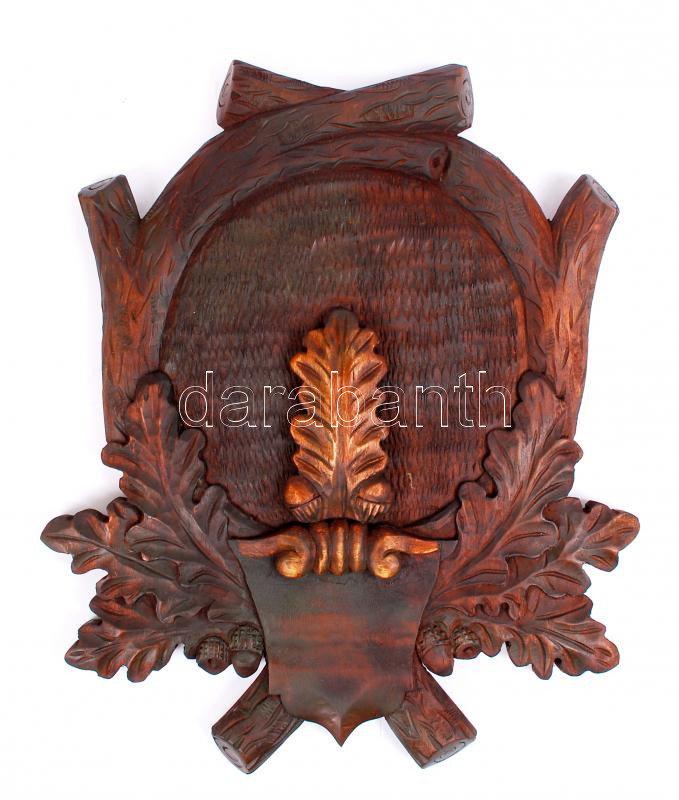 Beschreibung: Vaddisznó agyar tartó, faragott makk motívumokkal, pácolt fenyő, 33×29 cm