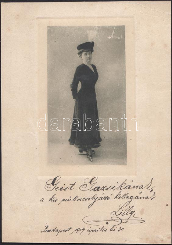 1909. április 30. Kronberger Lilly a női műkorcsolyázás magyar úttörője és világbajnoka által dedikált heliogravür (kis hibával), képméret 6x11 cm, karton 19x14 cm
