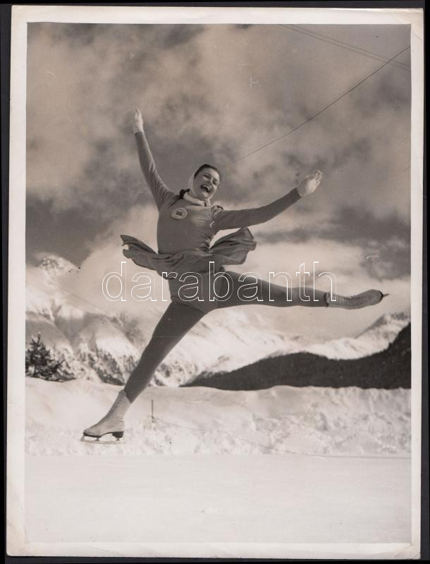 1948 Téli Olimpia, St. Moritz, Miss Jill Lindsay angol versenyző szép felugrása,a The Times archívumából, angolul feliratozott sport-reklámfotó, 22x17 cm
