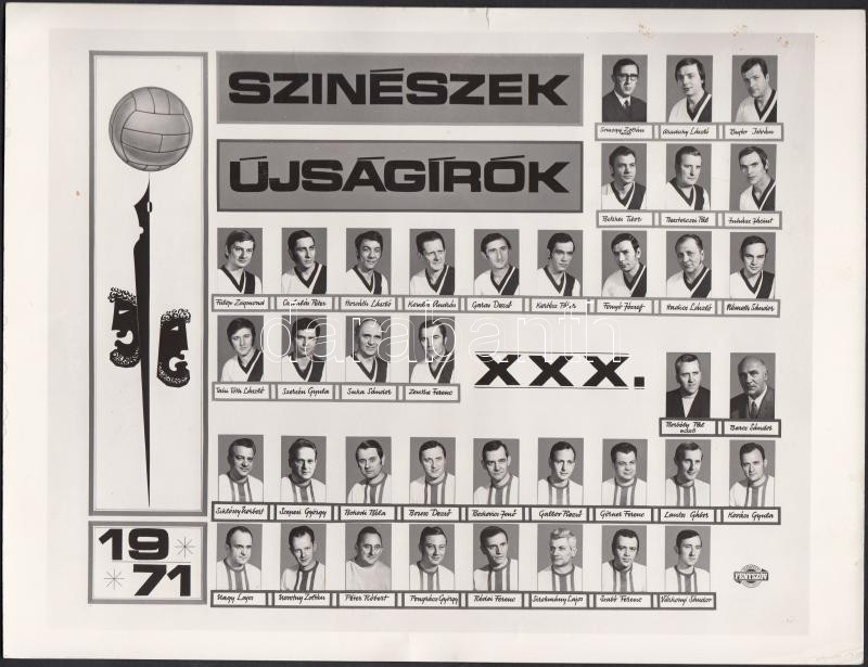 Beschreibung: 1971 Színészek - újságírók XXX. labdarugó mérkőzése, kistabló 40 nevesített portréval, 18x22 cm