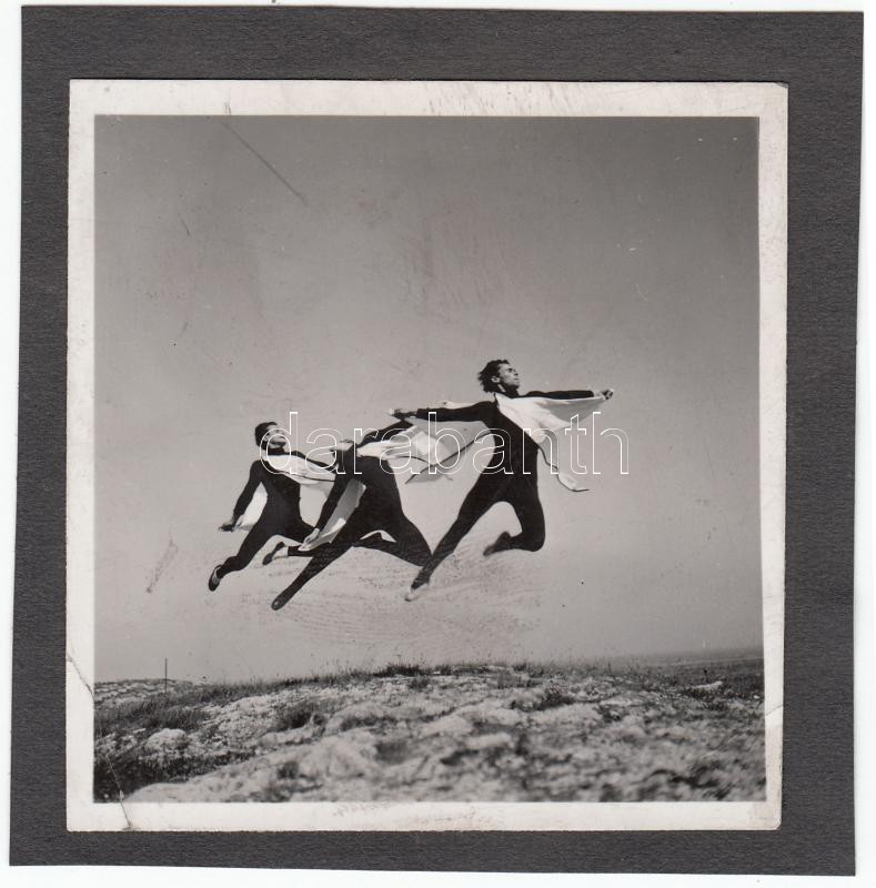 Beschreibung: cca 1930-1940 Szöllősy Kálmán (1887-1976): Hármas felugrás a hegytetőn, jelzetlen vintage fotó Szentpál Olga archívumából, 6x6 cm