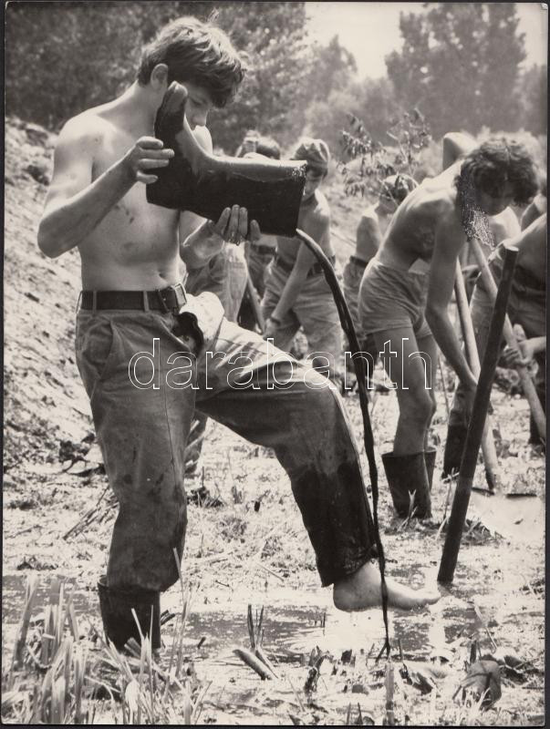 cca 1970 Urbán Tamás: Hanság, ha megtelik sárral a csizma, pecséttel jelzett, feliratozott vintage fotó a Magyar Ifjúság archívumából, a kép felületén hiba, retusálva, 24x18 cm
