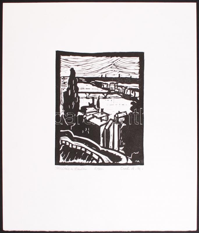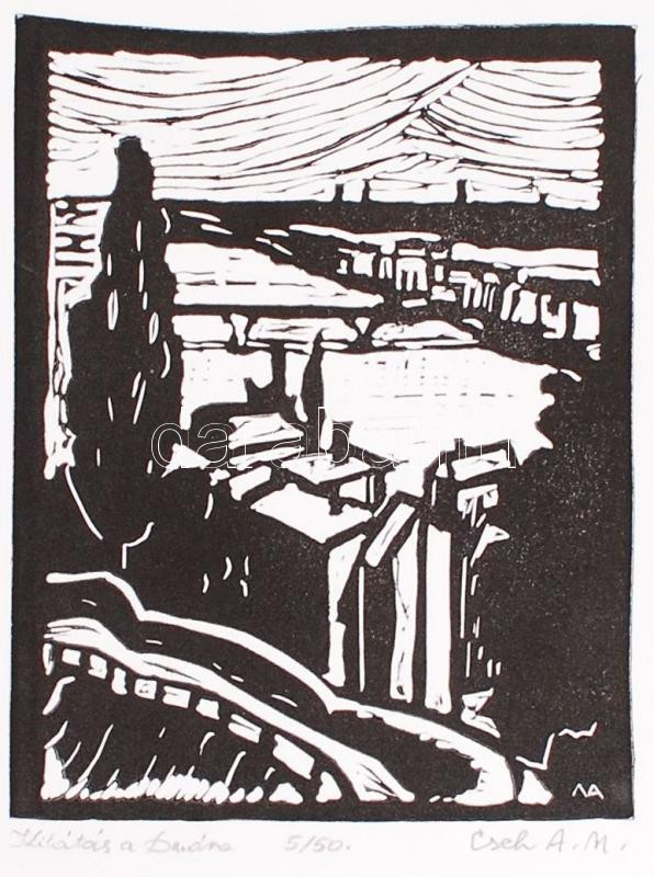Beschreibung: Cseh Anna Mária (1926-1999): Kilátás a Dunára. Linó, számozott, papír, jelzett, 17×12 cm