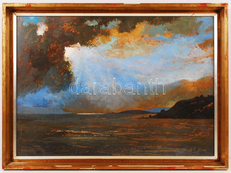 Beschreibung: Marsovszky Endre (1916-1989): Elmúlt a vihar. Olaj, farost, jelzett, üvegezett keretben, 50×70 cm