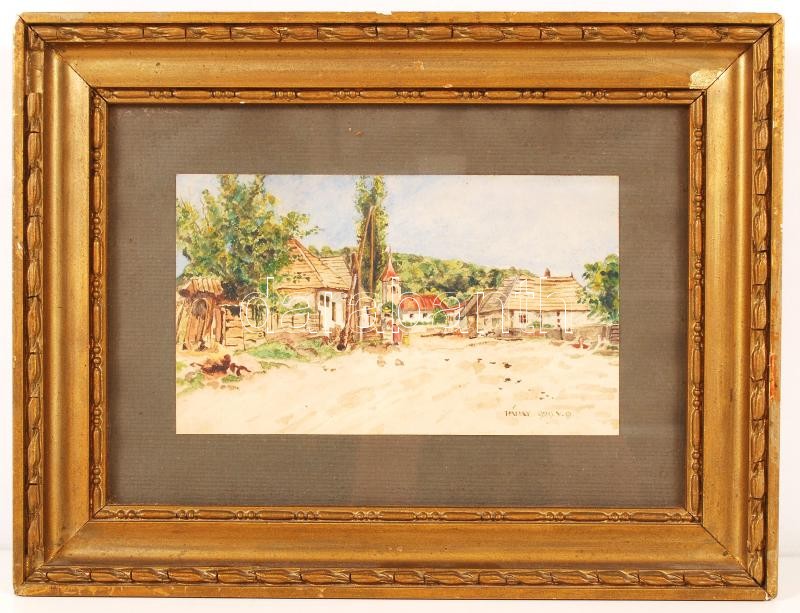 Beschreibung: Pápay jelzéssel(1929): Gémes kút, templomtorony. Akvarell, papír, jelzett, üvegezett antik keretben, 13x22 cm