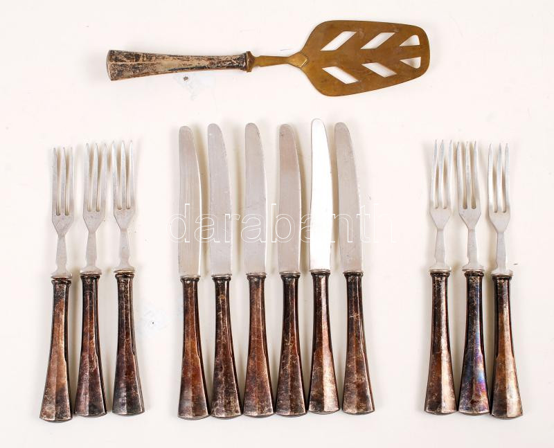 6 db ezüst (Ag) nyelű süteményes villa és kés és süteményes lapát, br: 197 g /