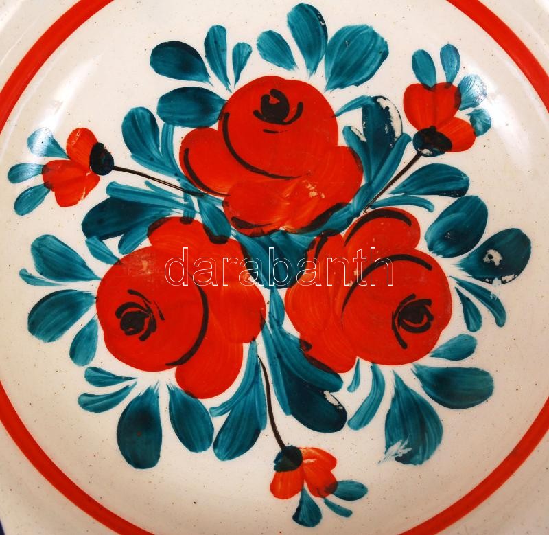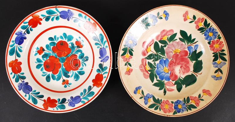 Beschreibung: 2 db népi virágmintás falitányér, apró lepattanásokkal, jelzett, d: 23 cm