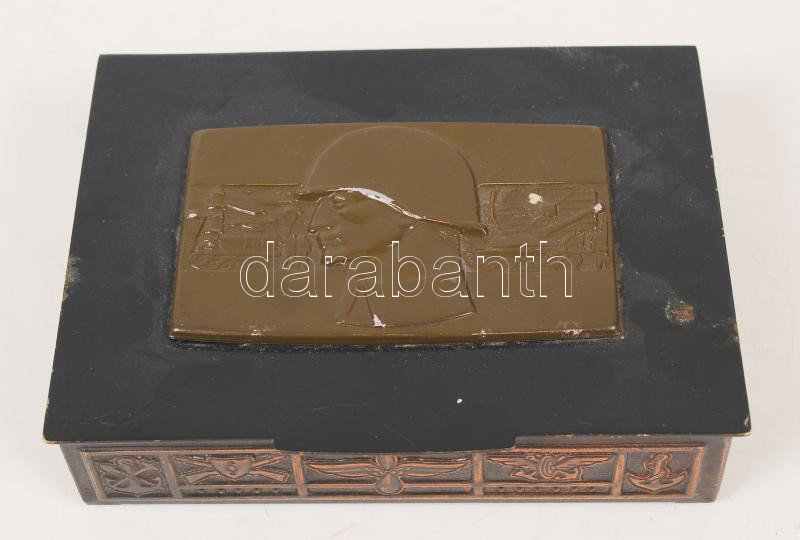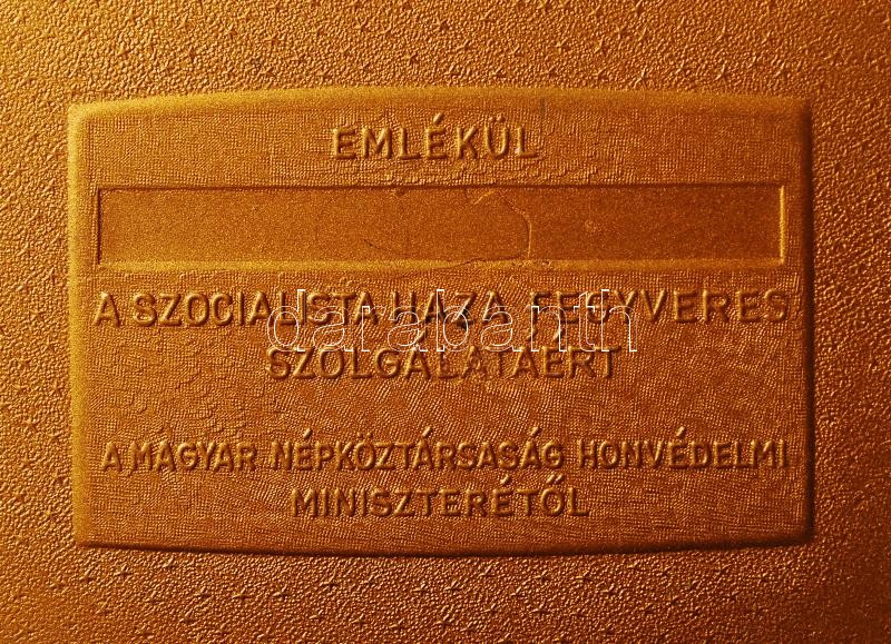 Beschreibung: "Emlékül a szocialista haza fegyveres szolgálatáért a népközt. honvédelmi miniszterétől" fém-doboz domborművel, 9×12 cm