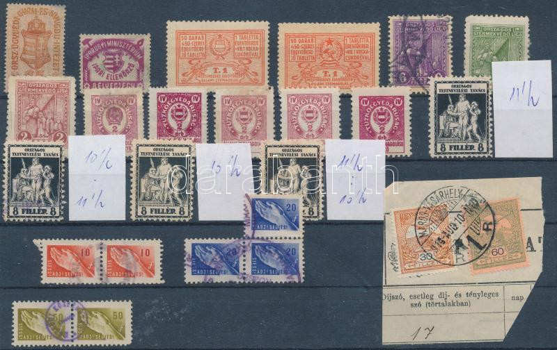 Beschreibung: 23 db okmánybélyeg, zárjegy, segélybélyeg + 1 távirati kivágás 2 Turul bélyeggel