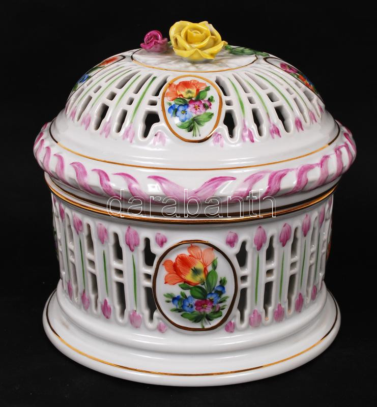 Herendi virágmintás áttört asztali bonbonier, tetején rózsával, apró l... https://www.darabanth.com/de/210-Fernauktion/210.0/Andere-Sammelgebiete/Porzellan~600006/Herendi-viragmintas-attort-asztali-bonbonier-tetejen-rozsaval-apro-lepattanassal-jelzett~II868531
