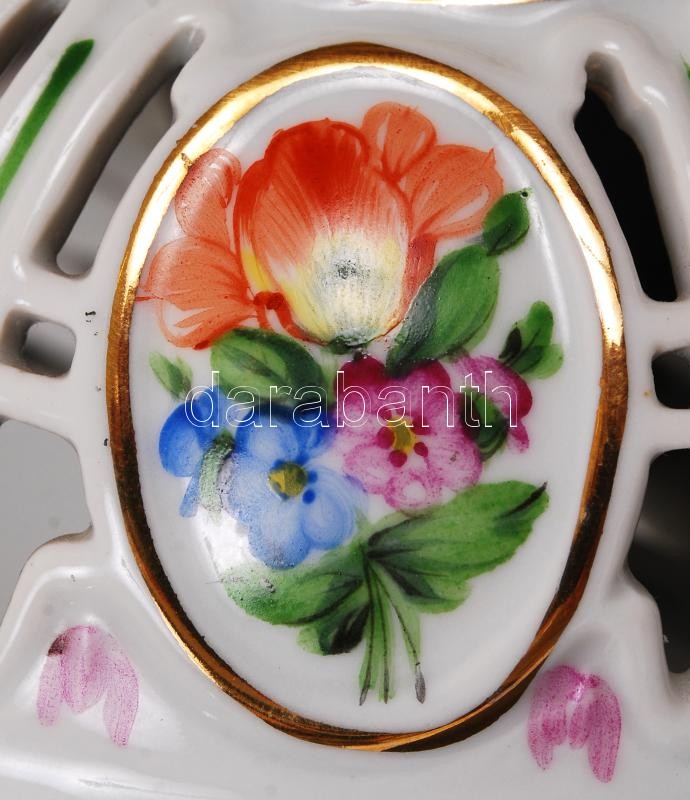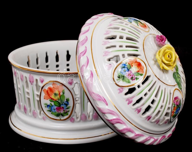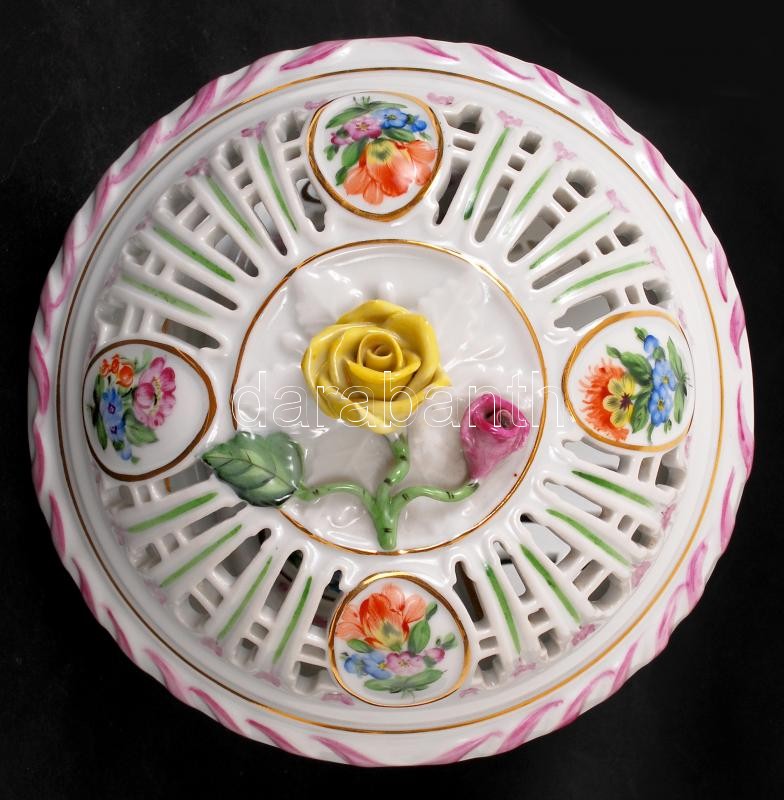 Beschreibung: Herendi virágmintás áttört asztali bonbonier, tetején rózsával, apró lepattanással, jelzett, d: 16 cm, m: 16 cm