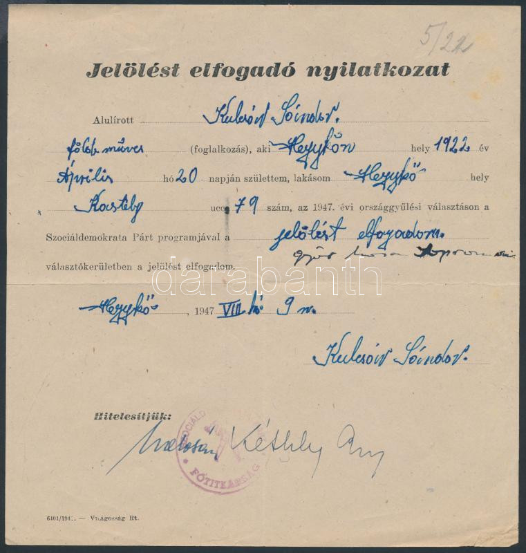 1947 A Szociáldeokrata párt jelölést elfogadó nyilatkozata Kéthly Anna... https://www.darabanth.com/de/210-Fernauktion/210.0/Andere-Sammelgebiete/Signatur~600017/1947-A-Szocialdeokrata-part-jelolest-elfogado-nyilatkozata-Kethly-Anna-es-Marosan-Gyorgy-sa~II867677