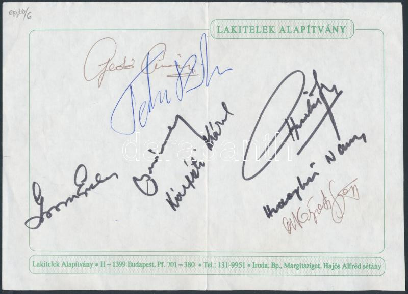 Beschreibung: Sportolók aláírása papírlapon (8 db aláírás, pl. Gedó György, Kárpáti Károly stb.)