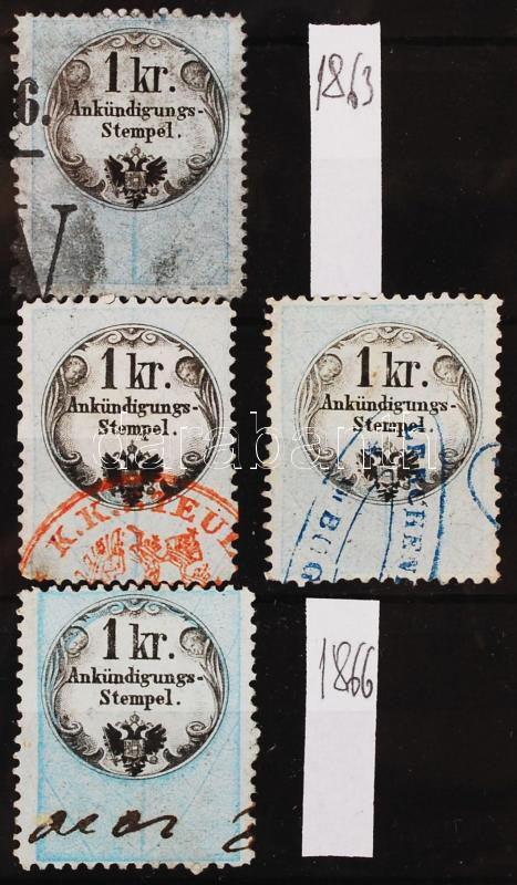 1863-1866 1kr Hírdetvénybélyegek, 4 db (40.000) https://www.darabanth.com/de/210-Fernauktion/210.0/Andere-Sammelgebiete/Stempelmarken~600014/1863-1866-1kr-Hirdetvenybelyegek-4-db-40000~II864727
