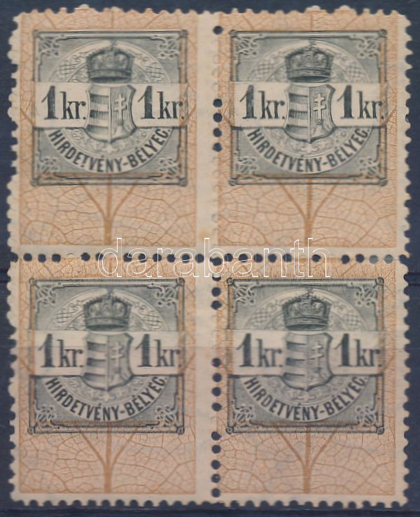 1881 1kr Hirdetvénybélyeg négyestömb, 11 1/2 fogazás https://www.darabanth.com/de/210-Fernauktion/210.0/Andere-Sammelgebiete/Stempelmarken~600014/1881-1kr-Hirdetvenybelyeg-negyestomb-11-12-fogazas~II863231