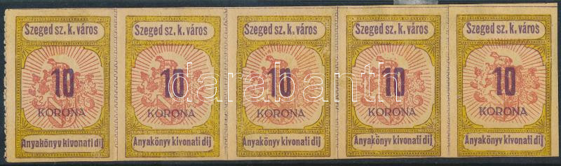 Beschreibung: 1920 Szeged Anyakönyvi kivonatdíj 10K ötöscsík, az 1. bélyeg II. típus, a többi I. típus