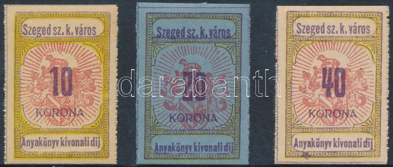 Beschreibung: 1920 Szeged Anyakönyvi kivonatdíj I. típus 10K, 20K, 40K