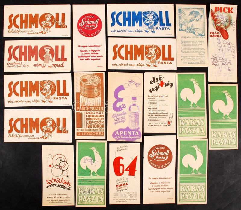 Beschreibung: 19 db számolócédula, közülük 12 különböző (Schmoll pasta, Kakas Paszta, Pick, Diana Sósborszesz, Apenta, stb.)
