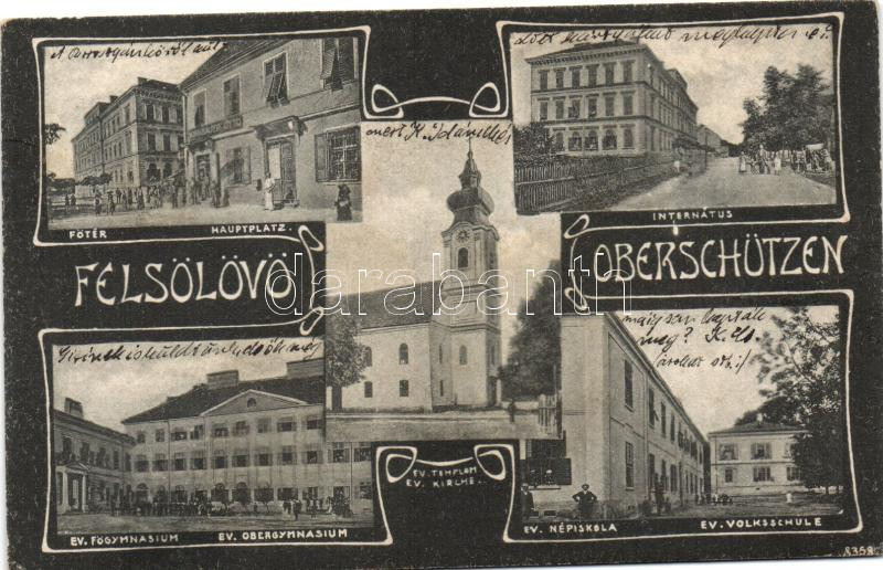Beschreibung: Felsőlövő, Oberschützen; Fő tér, internátus, Evangélikus templom, főgimnázium és népiskola / square, boarding school, church, grammar school Art Nouveau (EK)