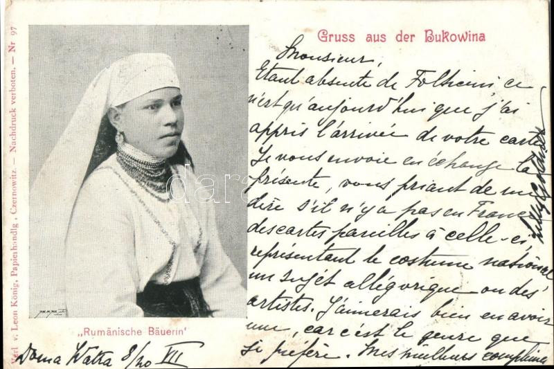 1898 Romanian peasant woman, Bukovina, folklore https://www.darabanth.com/de/210-Fernauktion/210.0/Ansichtskarten/Folklore~27/1898-Romanian-peasant-woman-Bukovina-folklore~II867689