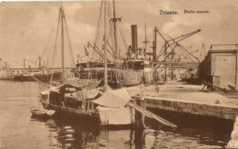 Trieste, Porto nuovo / port, steamship, boats (EK) https://www.darabanth.com/de/210-Fernauktion/210.0/Ansichtskarten/Italien~63/Trieste-Porto-nuovo-port-steamship-boats-EK~II865233