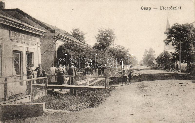 Beschreibung: Csap, utca, Lucsánszky János fűszer és vegyeskereskedése / street, shop