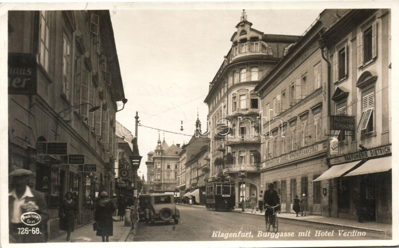 Klagenfurt, Burggasse, Hotel Verdino / street, hotel, automobiles, tra... https://www.darabanth.com/de/210-Fernauktion/210.0/Ansichtskarten/Osterreich~25/Klagenfurt-Burggasse-Hotel-Verdino-street-hotel-automobiles-tram-mortgage-institution-bank-~II852402