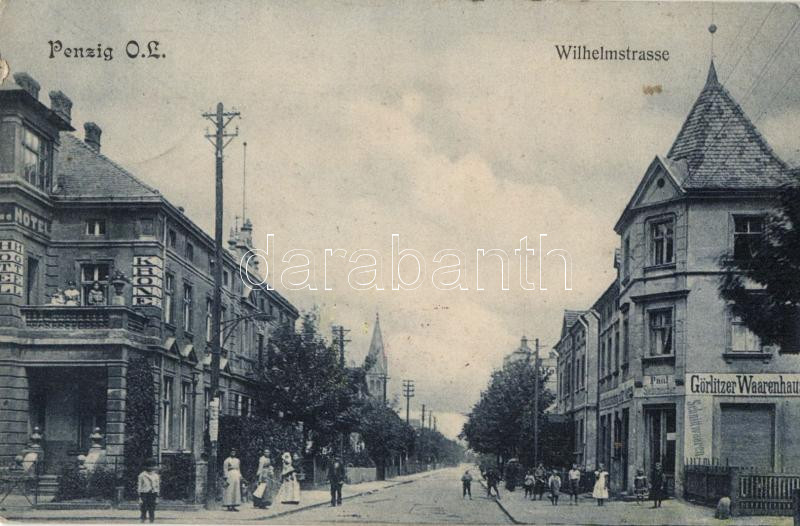 Beschreibung: Piensk, Penzig; Wilhelmstrasse, Hotel Krone, Görlitzer Waarenhaus / street, hotel