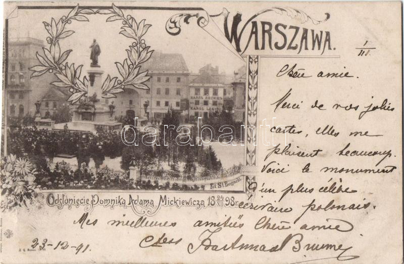 Warsaw, Odsloniecie Pomnika Adama Mickiewicza / Mickiewicz statue, flo... https://www.darabanth.com/de/210-Fernauktion/210.0/Ansichtskarten/Polen~48/Warsaw-Odsloniecie-Pomnika-Adama-Mickiewicza-Mickiewicz-statue-floral-cut~II863145