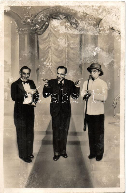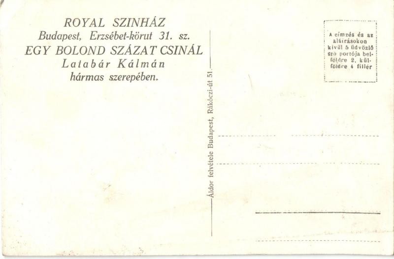 Latabár Kálmán, hátoldalon reklám: Budapest, Royal színház, Egy bolond százat csinál Latabár Kálmán hármas szerepével / advertisement on the back side (EK)