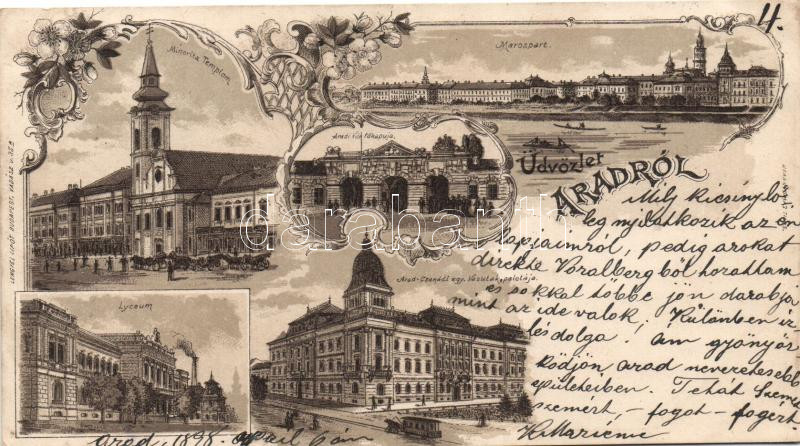 1899 Arad, Minorita templom, Vár főkapuja, Arad-Csanádi egyesült vasutak palotája, Líceum, villamos, Lengyel Lipót kiadása / church, gate, railway palace, lyceum, tram, floral, Art Nouveau litho