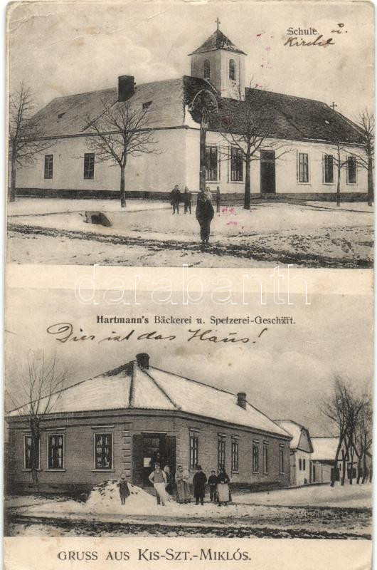Beschreibung: Kisszentmiklós, iskola, Hartmann's péksége és fűszer kereskedése / school, bakery (fa)