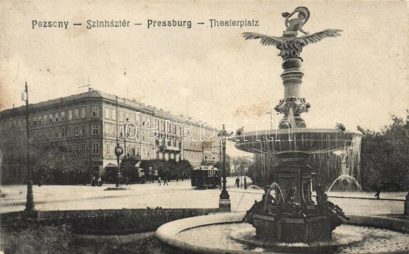 Beschreibung: Pozsony, Színház tér, szobor, villamos / square, theatre, statue, tram (fl)