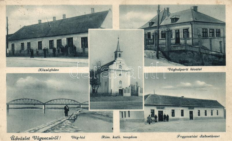 Vágvecse, Községháza, Vágbalparti hivatal, Vág híd, Fogyasztási szövet... https://www.darabanth.com/de/210-Fernauktion/210.0/Ansichtskarten/Slowakei~7/Vagvecse-Kozseghaza-Vagbalparti-hivatal-Vag-hid-Fogyasztasi-szovetkezet-town-hall-of~II862796