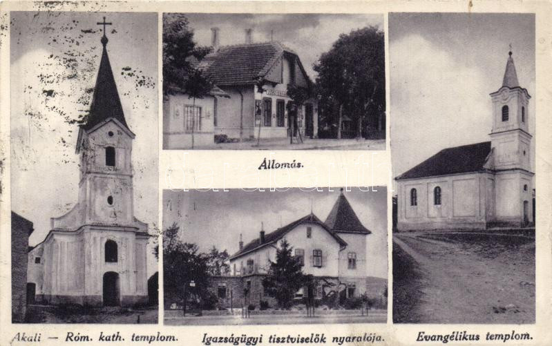 Beschreibung: Balatonakali, Római katolikus és Evangélikus templom, vasútállomás, Igazságügyi tisztviselők nyaralója, dr. Doroghy Kálmán ügyvédnek címzett képeslap